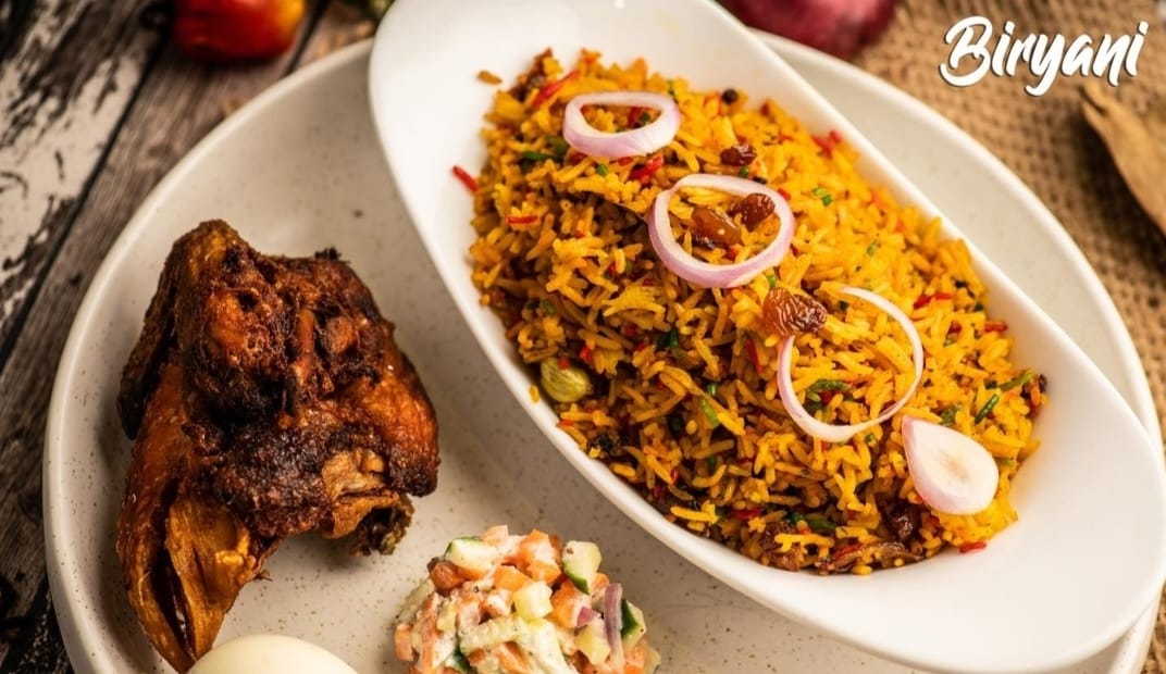 Biryani rice, fried chicken served with fried egg and raitha